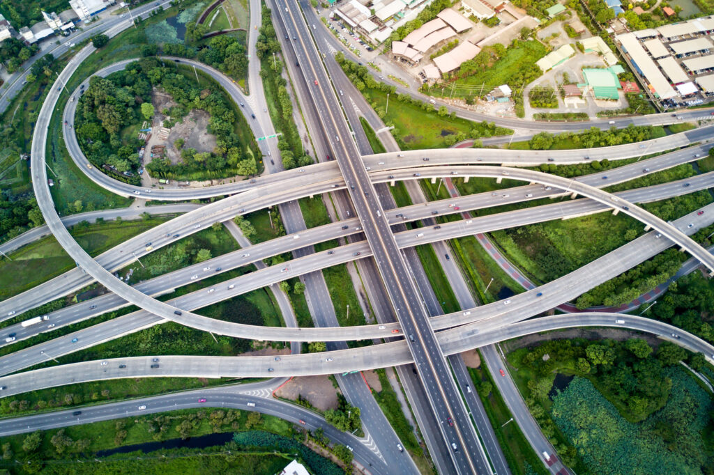 Aerial view of road interchange or highway intersection with busy urban traffic speeding on the road. Junction network of transportation taken by drone.